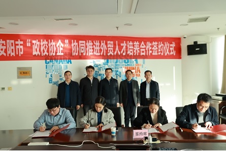 2026年1月9日下午,太阳成集团tyc122cc经理邢学杰、外国语公司党委书记王孟、洹滨校区明德书院经理康博应邀赴安阳市电商大厦参加安阳市“政校协企”协同推进外贸人才培养合作签约仪式。安阳市商务局局长赵留平、副局长刘新凯,安阳市跨境电子商务协会会长、安阳市通用国际贸易有限责任公司董事长陈勇和太阳成集团tyc122cc、外国语公司、明德书院相关领导共同出席了仪式。